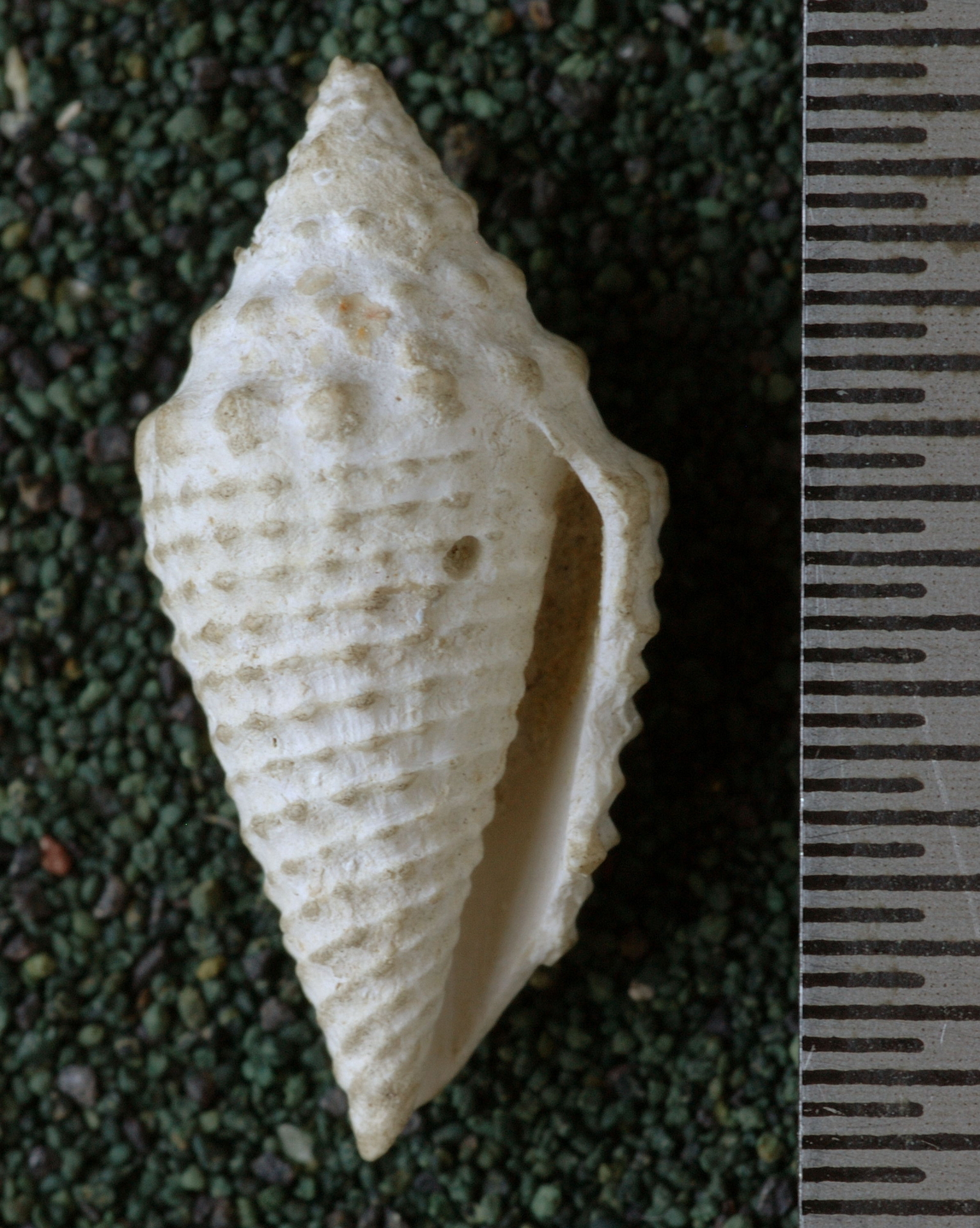 A small shell with a high turreted spire; body whorl covered by about 20 strongly beaded axial ribs; the row of beads at the periphery more prominent than others.