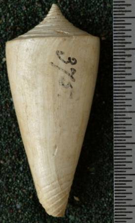 Late Miocene to Pliocene Indonesian Conus ngavianus martin, 1895. It differs mainly in the absence of a fasciole, lacks the adsutural band