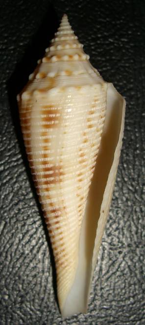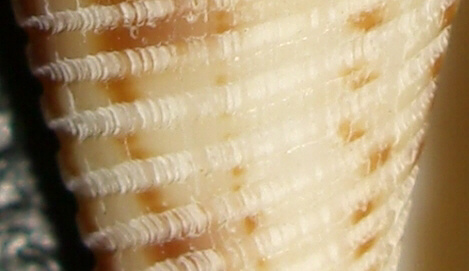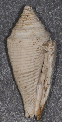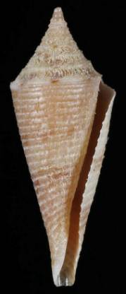 Conasprella juttingae (Pannekoek, 1936), from the early Miocene of Indone sia, differs in its beaded spiral cords on last whorl (3).