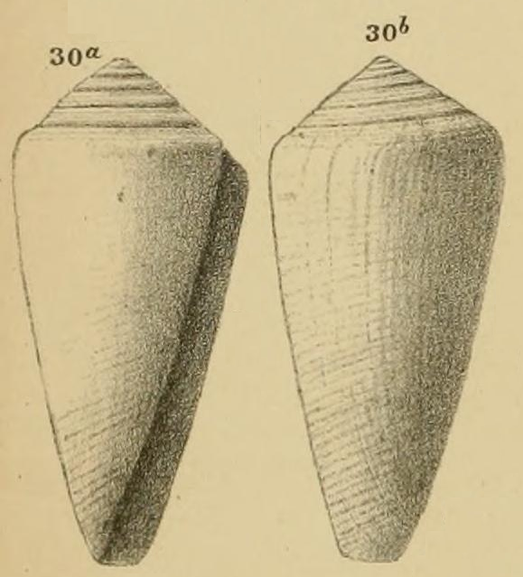 M. Sacco (1893, / Moll. terz. Piem., parte XIII, p. 57) applied the name C. expelagicus Sac to the mediocre drawing that represents them in the Atlas, a term that I cannot retain, because previously Mayer (1891, Journ. Conch.) had described a Conus basteroti whose type, graciously communicated by Dr. Rollier, is identical to the specimens in the Grateloup collection. Mayer compares his C. basteroti to C. clavatus; it is smaller in size, its curve is more compact, its spire is noticeably less tall; it is even closer to C. benoisti, from which it differs scarcely except 1) by its slightly flatter whorls and by the spiral grooves of its last whorl, which are more distant and slightly deeper; but this characteristic appears clearly only on well-preserved specimens; so that it is easy to confuse specimens of the two species when they are rolled up(6) .