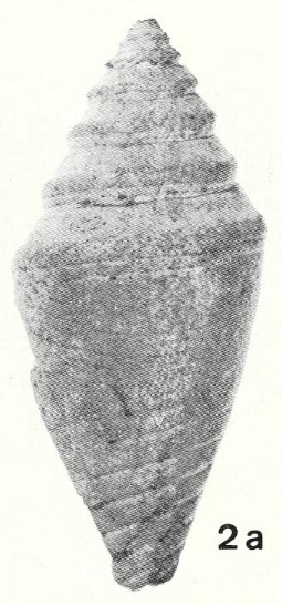 La parte centrale è liscia o con fini striature. L'apertura è sottile, la spalla è angolare, inclinata e debolmente concava o piatta. Le spire sono elevate, concave e striate nella parte superiore.