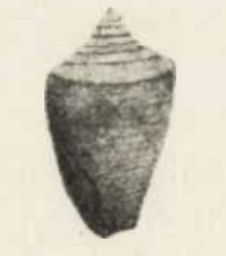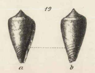 Jeden mały okaz, z Białogonu, przedstawiony na tabl. II., fig. 19, zaliczyłem do tego gatunku, chociaż wcale nie jestem pewny oznaczenia. Jest on 26 mm długi, a 13 mm szeroki, smukły. Skrętka jest mało wzniesiona, o profilu wklęsłym, składa się ona z 9 płaskich zwojów, początkowe tworzą smukły stożek. Zwoje pierwsze miały zapewne guzki na krawędzi, ale z powodu starcia nie występują one dobrze. Zwoje są rynienkowate, poziomo rowkowane, nadto mają podłużne linie przyrostowe. Zwój ostatni (22 mm długi) ma u góry słabo wypukły profil, niżej jest wklęsły i silnie zwężony, dlatego też skorupka ma kształt nieco gruszkowaty; w górnej części tego zwoju jest wyraźna, chociaż zaokrąglona krawędź. Warga prawa przyczepia się na krawędzi, u podstawy skorupki są poziome, nieco skośne prążki. Zaliczyłem tu także okaz z Dryszczowa, przedstawiony na ryc. 20. M. Hoernes podał i opisał ten gatunek z miocenu Wiednia (Die fossilen Mollusken. . . str. 29—30, tabl. 3, fig. 3), również R. H o e r n e s i A u i n g e r (Die Grasteropoden. . . str. 40). Pierwszy z nich rysuje okazy znacznie większe (długość 60 mm, szerok. 32), u okazów tych brak jednakowoż krawędzi na zwoju ostatnim, przeciwnie zwój ostatni jest zupełnie zaokrąglony, ryc. 3 d odpowiada nieco lepiej memu okazowi. S a cc o (1. c. str. 85) wytyka obu tym autorom błędne oznaczenie i nazywa okazy wiedeńskie Chelyconus globoponderosus Sacco. Mój okaz odpowiada w rzeczywistości lepiej włoskim okazom gatunku C. avellana (porównywałem z okazami z helvetienu okolicy Turynu), jednakowoż jest od nich smuklejszy. Przypomina też nieco C. pyrula Bronn. (Sacco 1. c. str. 88, tabl. 9, fig. 4), lecz ten gatunek ma wyższą skrętkę, zwoje nieco wypukłe, a krawędź silniej zaokrągloną. C. striatulus Brocc. (Sacco: I molluschi. . . str. 93 — 94, tabl. 9, fig. 30) różni się brakiem guzków na zwojach początkowych, krawędź na zwoju ostatnim ma wyraźniejszą.
