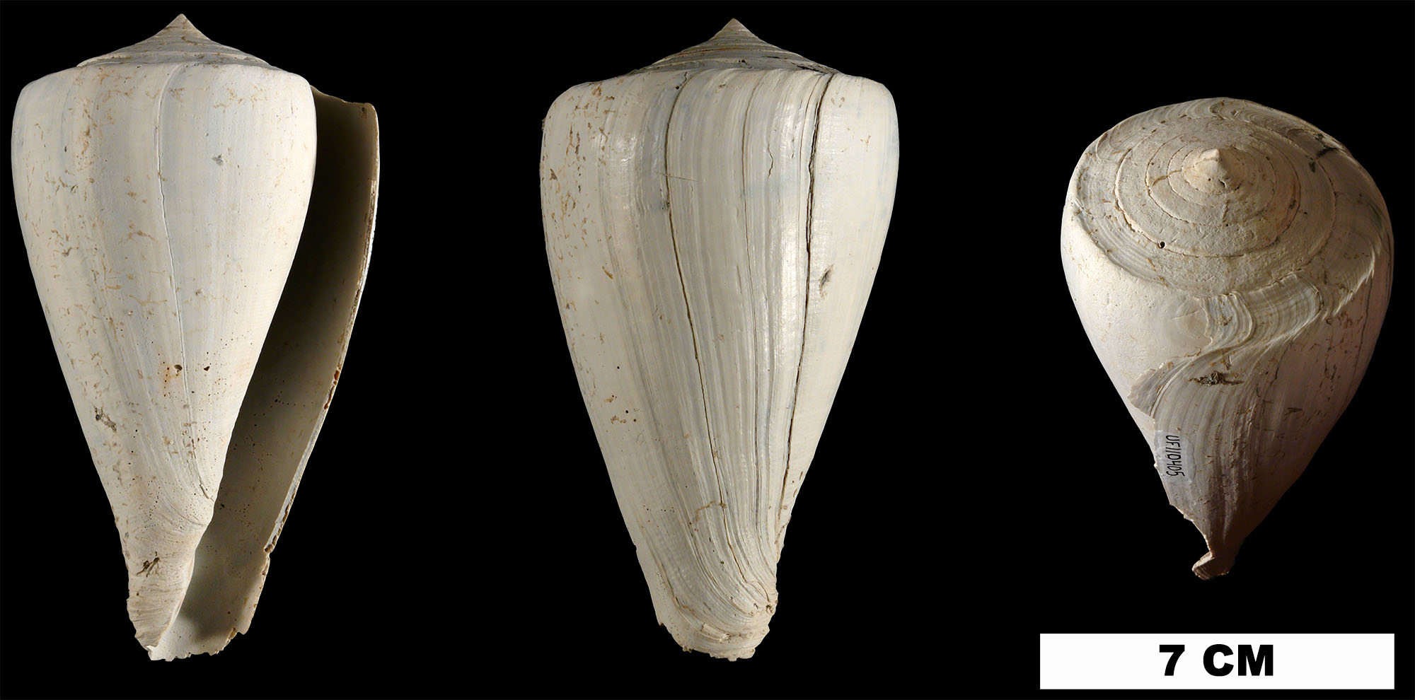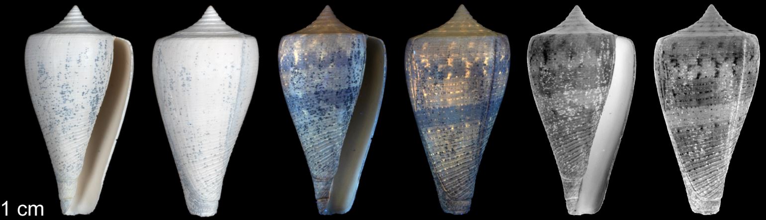 Specimen PRI 67555 (Fig. 18F) may be a fragment of a much larger specimen of C. haytensis than the other specimens shown here (C. haytensis is one of the largest species of fossil cone snails known from the Dominican Republic). If so, its secondary coloration pattern shows variation not exhibited by the other, smaller specimens: rows of spiral dots and dashes, with unpigmented regions in-between (1).