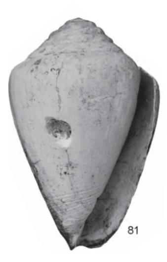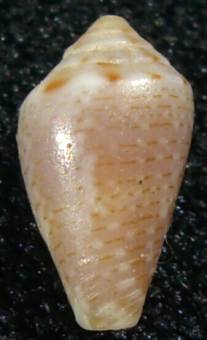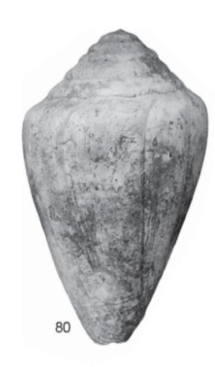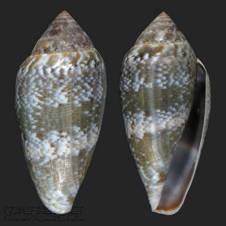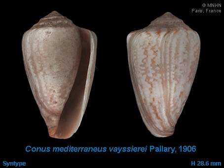 This specimen is more elongated than typical Conus vayssieri, however it has a discreet widening of the last whorl towards the base, the spire is low and pointed and the coloration is absolutely similar to that of the Syntype MNHN.