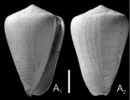 Conus moravicus (3) Figs 11 A1–A5 NHMW 2016/0033/0001 MM. 40,2 X 26,2 Figs 11 A1–A5 Mikulov-Kienberk (Czech Republic) |