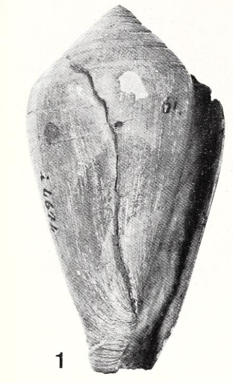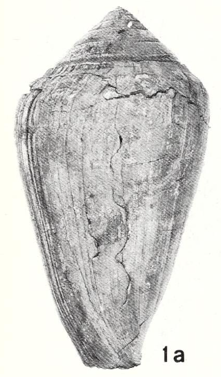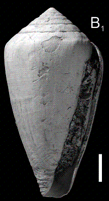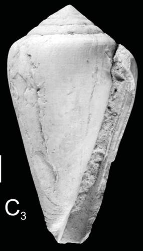 Discussion. This species is rather rare in the Paratethyan basins. Only few specimens from Steinebrunn ( Austria) agree with Miocene and Pliocene specimens as described by Hall (1966) and Davoli (1972). Several additional specimens from Poland and Hungary described by Krach (1981) and Kovács & Vicián (2013) might need confirmation. Herein we follow Hall (1966) in treating the Paratethyan shells described by Hörnes (1851) as conspecific with Conus ponderosus. Consequently, we consider Conus elmenus, which was introduced by De Gregorio (1885) as new name for the specimen illustrated by Hörnes (1851, pl. 2, fig. 6), as subjective junior synonym of Conus ponderosus Brocchi, 1814. Nevertheless, the species concept of Hall (1966) was too wide and we reject his decision to treat Conus olivaeformis Hoernes & Auinger, 1879 and C. transsylvanicus Hoernes & Auinger, 1879 as synonyms of C. ponderosus (see discussions of respective species).