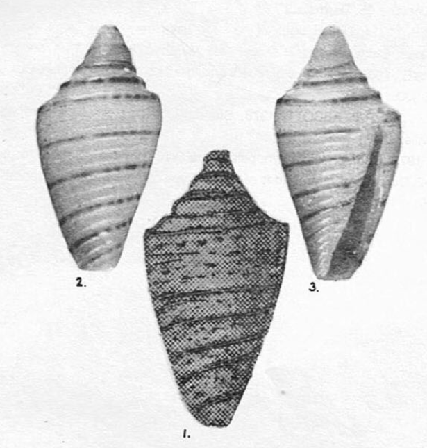 Die Schale dieser Art ist stumpf-kegelformig, ihr Gewinde spitz hervorstehend und im Profile tief concav, ans einer embryonalen und zelm Mittehvindungen gebildet, welche letztere nahezu flach sind, diurch eine tiefe Naht geschieden werden und ein System dichter Spiralfurchen tragen. Diese werden von scharf gekrunmten Zuwachsstreifen geschnitten. An der Schlusswindung ist der Spiralwinkel deutlich ausgepragt; der vor ihm gelegene Theil des letzten Umganges ist stark zugerundet, der Stirnabschnitt dicht uid tief gefurcht, und hinter diesen Furchen folgen bis zum Spiralwinkel sehr feine und dicht gedrangte Spirallinien, wahrend die Anwachslinien hier wenig in die Augen fallen. Die Spindel ist kaum gedreht; ein vorderen Ausschnitt fehlt, wahrend der hintere, nach den Zuwachslinien zu urtheilen. ziermlich tief gewesen sein muss.