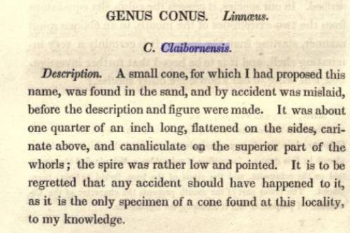 Description. A small cone, for which I had proposed this name, was found in the sand, and by accident was mislaid, before the description and figure were made. It was about one quarter of an inch long, flattened on the sides, carinate above, and canaliculate on the superior part of the whorls; the spire was rather low and pointed. It is to be regretted that any accident should have happened to it, as it is the only specimen of a cone found at this locality, to my knowledge (6).