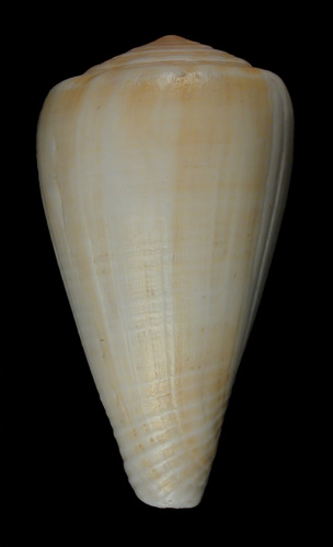 Descripció (2). Conquilla cònica, amb espiral lleugerament elevada, especialment la protoconquilla, i tendència escalariforme a la darrera volta (que no sempre és present). L’obertura és notablement estreta en tota la seva extensió. Longitudinalment la secció presenta una lleugera constricció a la part inferior de l’espiral, de vegades gairebé imperceptible. Aquesta zona està ornamentada amb cordons poc marcats, essent llisa en la part superior. No obstant, en morfotipus molt ornamentats els cordons poden comprendre tota la secció. La mida varia entre els 20 i els 40 mm aproximadament.
