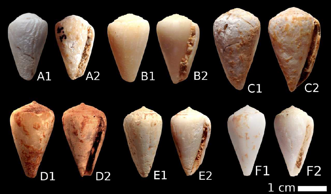 Observations (2). Traditionally only two Conus have been described in the Mediterranean Pleistocene: Conus ventricosus Gmelin, 1791 [=Conus mediterraneus] and Conus ermineus Born, 1778 [=Conus testudinarius]. Recently, Vicens (2015) added Conus vayssieri Pallary, 1906 to the fossil record of Mallorca, due to its elevation to the species rank of Conus mediterraneus var. vayssieri (see WoRMS, 2016). This is documented in Mallorca with specimens that could actually be in part simple Conus ventricosus juveniles, as they diverge morphologically from the holotype of Conus vayssieri, which is notably more globular and with a wider aperture. The great intraspecific variation that these species present, both in size and morphology, together with the rolling of many of the specimens, makes it considerably difficult to differentiate them from other Conus from West Africa, where this genus is currently widely represented. However, the authors have been able to recognize some specimens of Conus tabidus among the reviewed material, which differs from the juveniles of Conus ermineus (equivalent in size) by the suture, the scalariform section and the narrower opening. It also differs from Conus ventricosus by the higher spiral, more globular aspect and wider opening of the latter. The specimens of Conus tabidus observed from Mallorca and included in this work are morphologically equivalent to the holotype of the species (Kohn, 2009). We also consider as belonging to this species the specimen of Cuerda (1987, plate XXVIII, fig. 19) determined as Conus mediterraneus var. vayssieri, due to clear morphological affinities, refigured in this work (Fig. 1, D1-D2).
