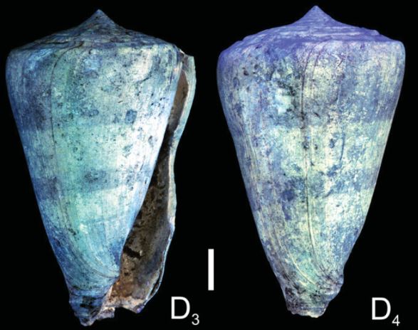 Moderately large shells, up to 81 mm in height; about 10 teleoconch whorls; early spire conical with nearly flat, weakly striate to nearly smooth spire whorls; late spire strongly depressed with slightly concave, faintly striate whorls and somewhat irregular, deeply impressed, irregular suture; subsutural flexure deep, strongly curved, strongly asymmetrical. Last whorl conical with distinct shoulder, position of maximum diameter directly below angulation; very weak and somewhat irregular constriction below shoulder within the adapical third and distinct constriction at base. Fasciole short, strongly raised; siphonal canal short, recurved, thickened; inner lip broad, twisted. Colour pattern in UV light comprising axially elongated blotches parallel to the subsutural flexure on spire, slightly narrower than the interspaces; blotches continue via shoulder on last whorl. Last whorl covered by 3–4 broad bands and small dashes and blotches in the interspaces; position of bands variable but typically in some distance from shoulder, at mid-whorl and in lower third of last whorl (5).