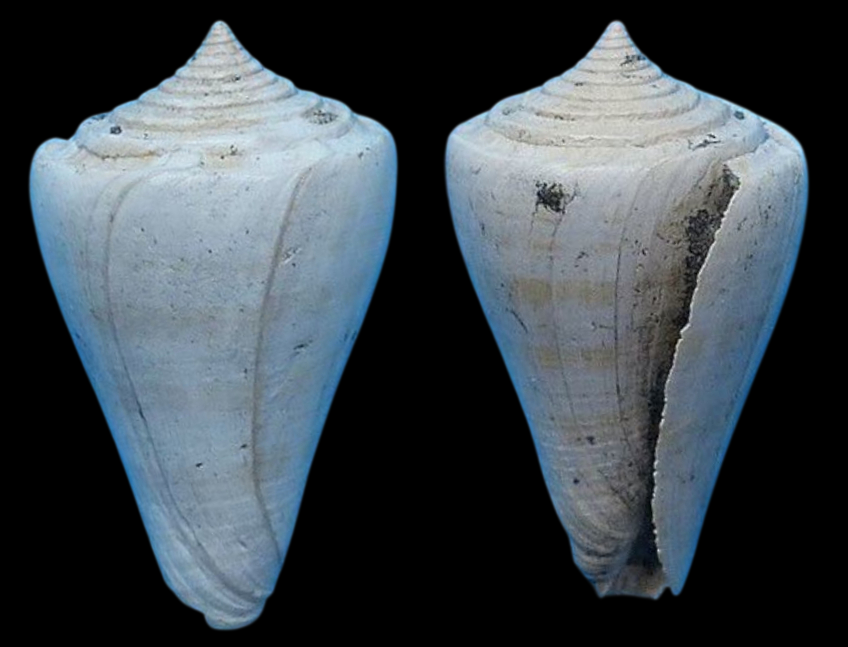 This cone agrees with C. williamgabbi Maury in general shape and dimensions, but the whorls of the spire are concave, without spiral threads, and there are no spirals in the lower part of the shell (2).