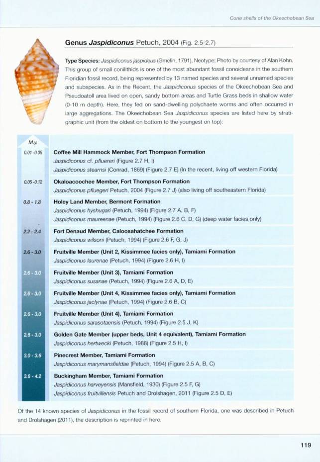 Personnel of the Florida Geological Survey collected the holotype of Conus harveyensis from “Harveys Creek, half a mile [ca. 0.8 km] above abandoned mill, Leon County, Fla., type and only locality” (Mansfi eld, 1930: 33). All specimens observed came from the Jackson Blu Formation at Jackson Blu , Leon County, Florida. Petuch (1994: pl. 94, fi g. m) reported C. harveyensis from “Petuch Unit 10” of the Pinecrest Beds (Tamiami Formation) exposed at the APAC Quarry, Sarasota County, Florida, but his figured specimen is likely C. jaspideus, not C. harveyensis (see p. 17).