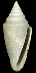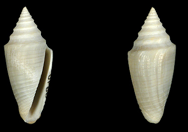 Description (2): Shell of average size for genus, extremely elongated, slender and cylindrical, with very high, very protracted and scalariform spire; shoulder sharply-angled, subcari-nate; body whorl sculptured with 18-20 low, rounded spiral cords; deeply-impressed spiral sulci present be-tween spiral cords on anterior half of body whorl; aperture narrow, widening slightly anteriorly.